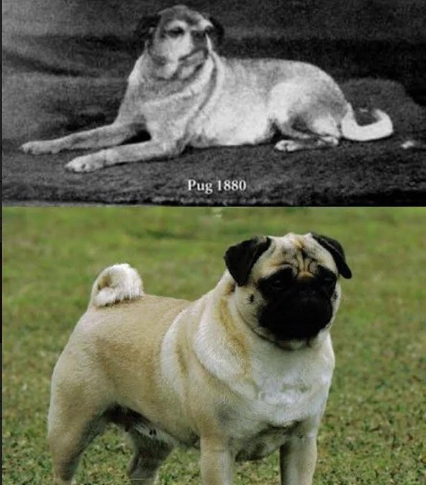 Köpek ırkları arasında yine insan eliyle mutasyona uğrayan Pug cinsi köpeklerin ilk halini bileniniz var mı? Bu değişimi kelimelerle anlatmam imkansız. Fotoğrafa bakarsanız ne demek istediğimi anlayacaksınız… Ne yazık ki bu mutasyon sonucu çok acı veren rahatsızlıklarla karşı karşıyalar.
